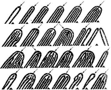 | Небольшое пояснение к пп.: ***Фенотип пальцевой дерматоглифики определяется комбинацией узоров на 10 пальцах:*** 1. ДУГОВЫЕ 1.1. A, (одна дуга) 1.2. AL, (превалирование дуги + петля) 1.3. ALW. (комбинативный узор: дуга, петля, узор(S-образный или завиток) 2. ПЕТЛЕВЫЕ 2.1. L, (одна петля) 2.2. LA, (превалирование петли + дуга) 2.3. LW. (превалирование петли + узор(S-образный или завиток) 3. ЗАВИТКОВЫЕ 3.1. W (S-образный или завиток) 3.2. WL. (S-образный или завиток + ПЕТЛЯ) Рис. Типы папиллярных узоров. ----------------------------------------------------------------------------- ЕщО к сведению: -=Цвет ногтей=- также дает представление о характере и физическом состоянии человека. Белые ногти Холодность, эгоизм, тщеславие, самомнение, высокомерие Бледно-розовые ногти Душевное тепло, отзывчивость, общительность, дружелюбие Красные Ногти Злость, испорченность, порочность Голубоватые (синюшные) ногти Как правило, признак нездоровья -------------------------------------------------------------------------------------- немного о БОЛЬШОМ ПАЛЬЦЕ БОЛЬШОЙ ПАЛЕЦ характеризует индивидуальность человека. Чем лучше он развит, тем больше развита индивидуальность человека. -=Но=- Если большой палец слишком велик это свидетельство: - гордости, - высокомерия его обладателя - переоценки своих сил. Люди с маленьким большим пальцем - часто более импульсивны, - поэтичны - более терпимы к другим людям, - НО они всегда имеют меньше сил осуществить свои планы и провести их в жизнь. Как уже говорилось выше: Верхний сустав большого пальца характеризует волю и инициативу, Второй сустав логику, Третий, нижний сросшийся с рукой сустав чувствительность, и одновременно силу осуществления или созидания наших намерений. -=Если воля развита сильнее, чем логика, то:=- - человек, всегда настаивает на своей правоте, - никогда не прислушивается к советам других - неразумен в своих решениях и требованиях. Все тираны и деспоты, во что бы то ни стало навязывающие свою волю другим, будь то в общественной или семейной жизни, имеют верхний сустав большого пальца значительно длиннее второго. Если второй сустав много длиннее верхнего Т.е. логика сильно преобладает над волей, то: - человек приходит сам к правильным решениям, - затем быстро и легко им изменяет, не имея достаточно воли настоять на своем. - он нерешителен - не способен на сопротивление, - но невоздержан, - капризен - легче других людей подвержены вспышкам бурной радости и порывам глубокой печали. Развитие верхней части третьего сустава, смотря с внутренней стороны руки (гора Венеры), характеризует высшую любовь, а нижней - животную или половую любовь. Если большой палец имеет квадратную или угловатую форму то его обладатель: - настойчив - стремится господствовать. Если палец при этом очень широк то человек: - непримиримый, - несоглашающегося ни на какие компромиссы, - часто жесткий. Если весь большой палец маленький и как бы вздутый его обладатель: - вспыльчив, - легко возбудим - чато это типичные эгоисты. НАИЛУЧШИЙ ТИП БОЛЬШОГО ПАЛЬЦА палец КОНИЧЕСКОЙ формы, которая характеризует спокойствие, мягкость, уравновешенность: “людей-джентельменов“ в лучшем смысле этого слова. Острый или заостренный верхний сустав указывает на способность вникнуть во “внутреннюю суть“ или “душу“ другого человека. Такая форма пальца встречается у людей, подверженных, как говорится “настроению духа“. Если верхний сустав большого пальца шарообразен то человек: - ч