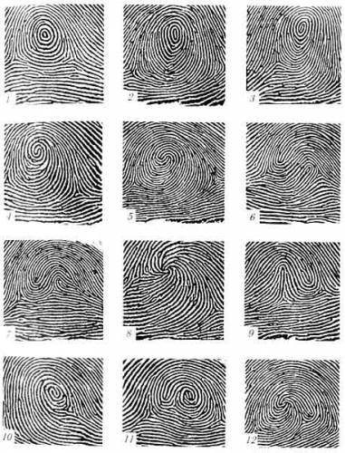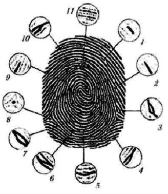 | И еще несколько слов о дерматоглифике. Раскрыты далеко не все ее возможности. Подробно пока изучена лишь сложность пальцевых узоров. Совершенно загадочными остаются: - так называемые радиальные петли (обращенные в сторону большого пальца), - а также ульнарные (обращенных в сторону мизинца). Есть сведения, что радиальные петли сопутствуют некоторым тяжелым заболеваниям, например - эпилепсии. Неразгаданными остаются и узоры на второй и третьей фалангах пальцев, а также на ладони. Поэтому ученые продолжают исследования. Кюкен и Нюелл отмечают, что формирование трех основных структур отпечатков пальцев, известных в криминалистике как дуги, петли и завитки, связано с геометрией подушечек при их сжатии: - сильно округленные подушечки дают завитки, - уплощенные подушечки производят дуги. Кроме того, уже известно, что -=чем дальше человек родился от Европы на восток и на юг - тем сложнее будут узоры на его ладонях и пальцах=-. Антропологи утверждают, что люди с самыми сложными узорами на пальцах живут в Тибете, а с самыми простыми - в Европе. Так что Восток - действительно дело тонкое. Не менее серьезные выводы по отпечаткам пальцев можно сделать и для семейной жизни. Доказано, что похожие люди чаще расстаются, партнеры должны дополнять друг друга, а для этого они не должны иметь преимущественно одинаковые типы узоров. Однако, не хуже известен и тот факт, что люди с дугами «спариваются» с себе подобными довольно редко, что само по себе (учитывая свойства их характера) не удивительно. В каждом отпечатке пальца существуют два типа признаков, используемые при идентификации: -глобальные - локальные. -=К глобальным относятся:=- - тип папиллярных узоров: • - дуга, • - петля, • - завиток, - центр узора, - дельта узора, - локальный гребневой счет (ЛГС), который определяется для каждого узора как число гребней на расстоянии “дельта-центр“, - их ориентация, - и расположение на пальцах и ладонной поверхности. -=К локальным признакам относят:=- - МИНУЦИИ(см. рис.), определяемые как точки изменения структуры папиллярных линий (разрыв, окончание, раздвоение и т.п.). На отпечатке пальца насчитывают до 50-70 минуций. Принято считать, что в отпечатках пальцев разных людей могут встретиться идентичные глобальные признаки, а картина минуций является уникальной. Рис. 1 Типы минуций, используемых при дактилоскопических исследованиях: 1 - фрагмент папиллярной линии, 2 - начало папиллярной линии, 3 - глазок, 4 - бифуркация-разветвление, 5 - крючок, 6 - мостик, 7 - островок, 8 - точка, 9 - окончание папиллярной линии, 10 - бифуркация-слияние, 11 – включения. Интенсивность узоров (ДЕЛЬТОВЫЙ ИНДЕКС - ДИ) оценивается по наличию дельт: - дуга (А) - бездельтовый узор (оценка 0), - петля (L) - однодельтовый узор (оценка 1), - завиток(W) и S-узор - двудельтовые узоры (оценка 2). Т.о. максимальная оценка интенсивности узоров - 20, а минимальная - 0 (сумма дельт на 10 пальцах). -=Самый простой узор - дуга, самый сложный - завиток и S-узор=-. Тип узора является качественной характеристикой, а гребневой счет (ГС) на каждом пальце (количество кожных гребешков внутри узора) и на 10 пальцах рук (суммарный гребневой счет - СГС) количественной характеристикой. Фенотип пальцевой дерматоглифики определяется комбинацией узоров на 10 пальцах: 1. ДУГОВЫЕ 1.1. A, (одна дуга) 1.2. AL, (превалирование дуги + петля) 1.3. ALW. (комбинативный узор: дуга, петля, узор(