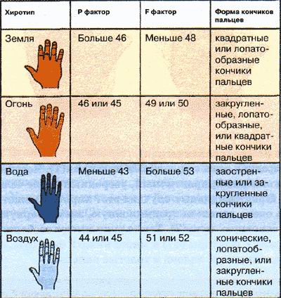 | Геометрия руки Наша ладонь своеобразное зеркало – увидеть в котором можно не только прошлое и будущее, но и черты нашего характера. Как известно, -=тонкая, тяжелая, сухая=- ладони – указывают на нервную и робкую натуру. -=толстая, полная, мягкая=- ладонь – свидетельство чувственности характера. -=Не очень толстая, но мягкая=- ладонь – свидетельство ясности ума, любви к роскоши и тенденции к чувственности. -=Вялая ладонь=- во все времена считалась несчастливым знаком. Людям с такой ладонью разочарований в жизни выпадает куда как больше, чем всем остальным. Еще одна особенность, по которой можно судить о человеке: к какой части руки/линии наклонена больше полость ладони? Если к -=Линии Жизни=- то разочарований и беспокойства в домашних делах у субъекта будет предостаточно. Если к тому же остальная рука обозначает слабое здоровье – то такое расположение полости на ладони будет дополнительным признаком слабости и беспокойства. -=Когда полость находится под Линией Судьбы=- она указывает на невезение в бизнесе, всем что связано с деньгами и мирскими делами. -=Если полость находится под Линией Сердца=- субъект познает разочарования в любви. РАЗМЕР РУКИ Размер руки также немаловажен для определения характера человека и склонности его к тем или иным видам деятельности. Так люди с большими руками часто делают очень тонкую радоту и любят вникать в детали. люди с маленькими руками как правило интересуются лишь делами крупными и ненавидят деталей. Они предпочитают осуществлять грандиозные планы, стоящие далеко за пределами их возможностей. Любят руководить, и как ни странно, даже почерк таких людей обычно бывает -=крупным и отчетливым=-. -------------------------------------------------------------------------------- Современная классификация руки Современные системы классификации рук имеют более методичный подход и больше учитывают бесконечное разнообразие форм рук и пальцев, существующих в действительности. Первая стадия в оценке формы руки состоит в том, чтобы определить относительные пропорции ладони и пальцев. Возьмите размеры, обозначенные буквами X, Y и Z Эти измерения могут быть использованы для того, чтобы точно подсчитать соотношение ширины ладони к длине ладони (фактор Р) и соотношение длины пальца к длине ладони (фактор F). Используйте приведенные ниже уравнения для подсчета фактора Р и фактора F: Р=Х/(Х+Y)*100 F=Z/(Z+X)*100 Основываясь на этой информации, используйте для вычисления вашего современного хиротипа таблицу. Вы можете обнаружить, что ваш хиротип подпадает больше чем под одну категорию. В таких случаях делается анализ обоих хиротипов. Полное чтение руки должно показать, какой из них более преобладает.