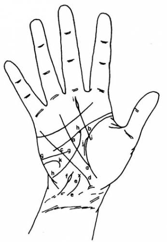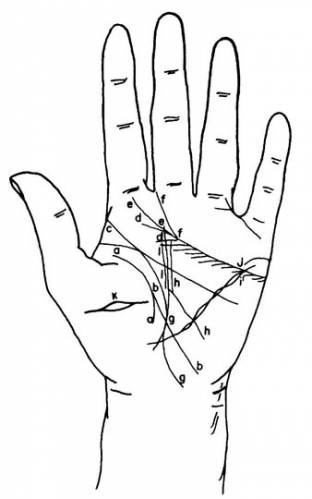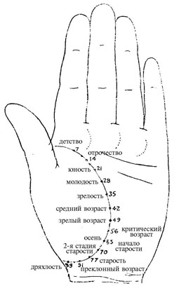 | Линия жизни Это ручеек жизненой энергии, который течет вокруг обширного холма Венеры. Она самая важная, указывает на количество жизненных сил, на возможность долго жить, на серьезные несчастные случаи. Поэтому мы должны хорошо ее изучить. Автор нашего введения уже упомянул о том, что, согласно г-же Фрайя, было бы лучше назвать ее линией энергии, так как по ее длине мы не можем определить, сколько лет мы должны прожить. Если бы это было так, то было бы преступлением или опасно говорить клиенту, сколько осталось жить, навязывая ему идею, которая в опасный момент может спровоцировать моральную и физическую неполноценность, Что может привести к скорой кончине. Таким же образом клиент, хорошо заботясь о своем здоровье, способен укрепить его и удлинить эту линию, которая является знаком жизненной энергии. С другой стороны, и это замечательно, линия жизни никогда не сойдет с пути в момент рассмотрения. Если, например, она указывает, что 50-летний человек может прожить до 70 лет, он, возможно, проживет до 80, но в 60 он не умрет, если только с ним не случится несчастье, которое в любом случае будет написано на его руке. Но как бы то ни было, когда линия жизни достинает линии вокруг кисти, то человек должен прожить 80 лет. Разделив линию жизни от начала ниже холма Юпитера до этой точки на 10 или 7 лет, мы получим ступени жизни. От рождения до 7 лет — это возраст интеллекта (детство). Инстинкты, вероятный характер. От 7 до 14 лет — это трудный возраст (отрочество, подростковый период). Естественные склонности. С 14 до 21 года — период половой зрелости, юность. Иллюзии и надежды. С 21 до 28 года — период чувственных удовольствий (молодость). Физическая любовь, энтузиазм, непостоянство. С 28 до 35 лет — период мужественности (зрелость). Физические и интеллектуальные удовольствия. Лучшее время жизни. От 35 до 42 лет — средний возраст. Твердое желание богатства или почестей. От 42 до 49 лет — зрелый возраст. Мудрость, рассудок, кульминационная точка жизни. От 49 до 56 лет — критический возраст. Осторожность, предвидение, забота о здоровье, чтобы завершить жизнь. От 56 до 63 лет — осень. Размышления и первые сожаления. От 63 до 70 лет — начало старости. Слабости, боли, проблемы или покой в доме. От 70 до 77 лет — вторая стадия старости. Пальцы становятся узелковыми, сердце тоже. Характер становится жестким. От 77 до 84 или 91 года — старость. Человека охватывает недоверие, он чувствует, что его ждет могила. После 91 года, если человек все еще живет, он снова становится ребенком, равнодушным, как растение, инертным, похожим на привидение. Чтобы классифицировать события по их датам, нужно посмотреть на ступени жизни. Теперь мы можем рассмотреть таблицу главных особенностей линии жизни. Хорошая линия, длинная, розовая, без знаков, непрерывная — хорошая и длинная жизнь. Если она бледная и не очень широкая — хрупкое здоровье, флегматичность. Бледная и широкая — мало силы, много энергии. Очень широкая — плохое здоровье (мнительность). Красная — хорошее здоровье. Красная и широкая — жестокость. Багровая и очень широкая — злобность, безжалостность. Синеватая — характер венеры. Темно-синяя — характер Марса (плохой характер), жизненные силы. Длинная — возможность долгой жизни. Длинная и тонкая — чуть застенчивый, нервный человек. Как цепь, разорванная — болезненная и проблемная жизнь. Разорванная в момен