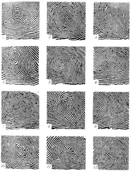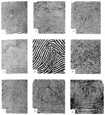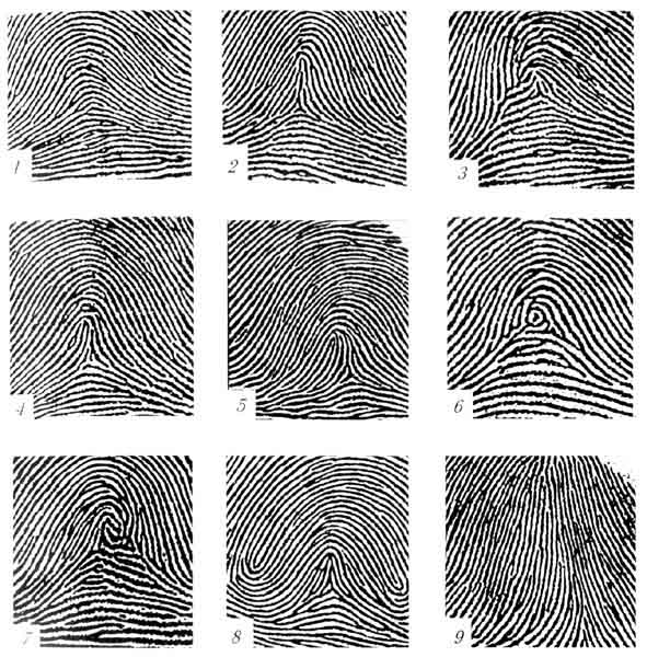 | Итак, проверь себя : Говоря об отпечатках пальцев, невозможно обойти вниманием и отдельные разновидности распространенных папиллярных узоров: дуг, петель, завитков. В частности Дуговые узоры. Неопытный обыватель на руке может спутать их с петлевыми или даже завитковыми. Дабы этого не случилось – обратите внимание на нижеприведенный снимок: Рис.1 Дуговые узоры образуются наружным потоком папиллярных линий и в средней части узора имеют изгиб — внутреннюю дугу, строение и форма которой служат для подразделения их на виды. -=Виды ДУГОВЫХ папиллярных узоров ногтевых фаланг пальцев рук:=- • 1 - простой дуговой узор; • 2 - шатровый дуговой узор; • 3 - дуговой узор с неопределенным строением центра; • 4, 5 - ложно-петлевые дуговые узоры; • 6, 7 - ложно-завитковые дуговые узоры; • 8 - редко встречающийся узор, относящийся к дуговым; • 9-аномальный узор (классифицируемый, как и дуговые, цифрой 1). Простые дуговые узоры (1) папиллярные линии образуют в средней части узора небольшой, сравнительно плавный подъем; Шатровые дуговые узоры (2) папиллярные линии образуют в средней части крутой изгиб с несколькими вертикальными линиями в середине. Разновидностью шатровых узоров являются елкообразные и пирамидальные дуги; Дуговые узоры с неопределенным строением центра (3) папиллярные линии во внутренней части дуги образуют своеобразный неопределенный узор, не позволяющий отнести его к другим видам дуговых узоров; Ложно-петлевые дуговые узоры (4,5) папиллярные линии во внутренней части дуги образуют узор, внешним строением напоминающий петлевой, но таковым не являющийся. -=Выделяются 3 случая определения ложности узоров:=- а) две линии, сходящиеся под углом в одну, не образуют полукруглой головки, характерной для петлевых узоров; б) две сходящиеся под углом линии продолжаются в виде одной, не образуя головку петли; между ними могут находиться одна или несколько линий, усиливающих эффект ложности; в) головка внутренней петли сливается с линией, являющейся частью наружного потока и уходящей в него, минуя ложную дельту; Ложно-завитковые дуговые узоры (6,7) папиллярные линии во внутренней части дуги образуют узор, внешне напоминающий завитковый, но в нем отсутствуют особенности, определяющие завитковые типы узоров; Редко встречающиеся узоры, относящиеся к дуговым,(8) папиллярные узоры петель-клубков и изогнутых петель, головки которых расположены у самого края узора (около ногтя), а центральная часть имеет узор дугового типа; не отображаются на дактилокарте при незначительной недопрокатке пальцев; Аномальный узор (9) папиллярные линии внутреннего потока внешне напоминают петлевой узор, но ни одна из линий петли не образует; они сливаются под острым углом в вершине узора или «уходят» вверх (к ногтю). Аномальные узоры классифицируются как ДУГОВЫЕ. Разновидности подобного типа, характерны так же и для Петлевых узоров. Петлевые узоры • состоят из наружного и внутреннего потоков папиллярных линий и имеют одну дельту. • Образуются внутренним потоком, папиллярные линии которого, начинаясь у одного края пальца, изгибаются вверх и к центру и, образуя петлю, возвращаются к тому же краю. • Петлевой узор состоит из ряда петель, находящихся одна в другой, • -=НО=- для отнесения узора к петлевому типу необходимо, чтобы в центре узора хотя бы одна линия образовывала заверше