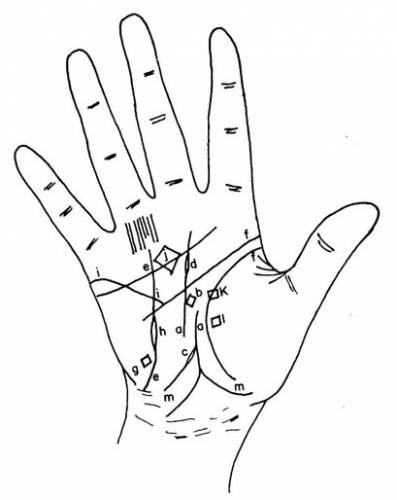| Придет время, когда линии будут не подниматься, а идти вниз (рис. 83). Это время не отличается таким подъемом, как при восходящих линиях. Точка, когда восходящие линии исчезают и появляются линии, идущие вниз (рис. 84), — поворотный пункт в жизни человека. Эта точка является пиком его способностей, периодом наибольшего расцвета сил, после которого ему будет труднее чего-либо достичь. Я изучил много таких знаков, значение которых было подтверждено жизнями многих людей. Па одних ладонях такой знак появлялся раньше, на других — позже, но в любом случае это пик человеческих сил, данный каждому природой. Иногда в том месте, где присутствует восходящая линия, появляется остров (рис. 85). Это указывает, что ослабление здоровья так истощит силы человека, что ему уже никогда не удастся стать прежним. Когда поворотная точка появляется около 50 лет, это естественное убывание физических сил, данных человеку природой. Когда восходящие линии или одна линия поднимаются к Юпитеру (рис. 86), это результат действия огромных амбиций, толкающих их обладателя в борьбу за победу; направление его амбиций вы сможете определить но преобладающей фаланге пальцев. Линия, восходящая к Сатурну (рис. 87), — знак огромных желаний субъекта добиться успехов в области, где правит Сатурн. Мир его желаний вы опять же можете определить по господствующей фаланге пальцев. Если линия идет к Аполлону (рис. 88,), это указывает на желание субъекта реализовать себя и области Аполлона в соответствии с преобладающими фалангами. Если линия нацелена на Меркурий (рис. 89), то человеческими желаниями правит бог Меркурий. Не спутайте ее с линией Меркурия. Если линия идет от линии Жизни к Верхнему Марсу (рис. 90), то амбиции человека освещены влиянием Марса; лунные качества оказывают сильное влияние на жизнь человека, когда отщепление идет на Луну (рис. 91). Помните, что это должны быть изящные, тонкие линии, идущие от линии Жизни, а не случайные линии, покрывающие ладонь. При общей оценке линии Жизни важно учитывать окончание линии, которое, как правило, указывает на конец жизни. Изучая изменение линии на всех ее этапах, мы узнаем о силе человека, состоянии его здоровья в разное время, периодах слабости, различных болезнях. Когда же мы осмотрим конец линии, то сможем подвести итог всему тому, что мы узнали относительно этой линии. Линия Жизни может заканчиваться на разных ладонях в разных местах. Если линия глубокая и сильная, она может закончиться такой же сильной, как и была: линия просто быстро остановится, не прерываясь никаким особым знаком (рис. 92). В этом случае можно говорить о том, что человек останется сильным до самого конца, его смерть не будет омрачена изнуряющими болезнями. При таком окончании надо тщательно проверить линию Головы, линию Сердца и изучить тип субъекта. Если субъекта можно отнести к юпитерианскому или марсианскому типу, то быстрая смерть наиболее вероятна. Если на линии Жизни нет никаких знаков, а на линии Головы имеется глубокая поперечина, крест, точка или звезда, по временной шкале совпадающие со временем прекращения линии Жизни, то именно знаки на линии Головы будут указывать на кончину (рис. 93). Внезапное окончание линии Жизни указывает на быструю смерть, а повреждение на линии Головы будет ее причиной. Знак в виде поперечной линии, креста, точки или звезды на линии Сердца 