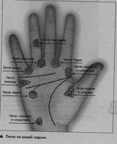 | ДЕВЯТЬ ПЕТЕЛЬ Рассматривая свою руку, каждый из нас замечал, что рисунок отпечатков пальцев часто повторяется и на самой ладони. Изогнутые рисунки, расположенные на холмах руки оставляют отметины на наших ладонях, но что они означают? Попробуем разобраться. Специалисты выделяют 9 различных петель на ладони человека: 1 Петля Раджи 2 Петля Важности 3 Петля Юмора 4 Петля Музыки и «пчелка» 5 Петля Природы 6 Петля Памяти 7 Петля Тщеславия 8-9 ПетлИ Смелости и Сочувствия Рассмотрим каждую немного подробней. Для этого взгляните на фото. Петли ладони выглядят как лассо – это не замкнутые окружности, а открытые круги различных размеров. Количество петель на ладони каждого человека различно, но внимательно присмотревшись к кожному рисунку, вы наверняка сможете обнаружить у себя хотя бы одну из них. Итак: ПЕТЛЯ РАДЖИ (петля Харизмы) Очень необычный и крайне положительный узор. Расположен между Указательным и Средним пальцами. -=Говорит о руководящих способностях человека=- Как правило, люди, занимающие высокие посты в науке, бизнесе и искусстве, все без исключения обладают подобной петлей. Она указывает на способности человека влиять на окружающих его людей, умение организовывать их вокруг себя и вести к цели. ПЕТЛЯ ВАЖНОСТИ Эта петля встречается чаще, чем Петля Раджи. Расположена между Средним и Безымянным пальцами. Если петля присутствует на вашей руке – это означает, что в жизни у вас есть некая миссия, ради свершения которой вы пришли на эту землю, и стремитесь достичь ее всеми силами и средствами. Как правило, люди с таким знаком на ладони – ответственные, серьезные личности, мотивированные на достижение определенной цели. НО Если петля расположена ближе к Сатурну (Среднему пальцу) – это является свидетельством некоторой психологической слабости натуры. ПЕТЛЯ ЮМОРА Расположена между Безымянным пальцем и Мизинцем. Обладатели такой петли: − любят весело проводить время − смеяться над шутками судьбы − будут работать ради удовольствия, даже если труд будет оплачиваться не так высоко как в других местах − чаще всего не очень стремятся занять высокое положение. ПРИМЕЧАНИЕ: -=Если у вас есть=- и Петля Юмора и Петля Важности это говорит о том, что не смотря на то, что вы серьезно воспринимаете жизнь и стремитесь к достижению своих целей, вы непрочь насладиться и самой дорогой к достижению этой цели. Сам процесс ее достижения доставляет вам удовольствие ни чуть не меньшее, чем достигнутая цель. ПЕТЛЯ МУЗЫКИ И «ПЧЕЛКА» Расположена на Холме Венеры, вблизи большого пальца. Как правило имеется у больших любителей музыки, эмоционально откликающихся на нее. Если она присутствует на обеих ладонях человеку скорей всего «светит» карьера музыканта, ну или по крайней мере, он будет чрезвычайно увлечен музыкой, что многократно будет усиливаться, при наличии особого знака «Пчелки», расположенного -=в центре холма Венеры=- Он означает любовь не просто к музыке, а именно к музыке струнных инструментов. Ищите «пчелку» если вы играете на гитаре/бас-гитаре в рок-группе или скрипке или альте в симфоническом оркестре. ПЕТЛЯ ПРИРОДЫ Такой знак появляется на ребре руки, либо под линией Сердца, либо у холма Луны Ее обладатели: − интересуются природой − любят узнавать больше о ней − любят бывать на свежем воздухе − становятся хорошими ландшафтными дизайнерами − 