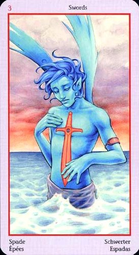 | не знаю как именно говорить о тройке. С одной стороны это именно символ невозможности единения - над головой небеса, до горизонта океан, они не пересекаются и живут порознь, а между ними это разбитое сердце. С другой стороны эта карта уже указывает на преодоление боли, фея с разбитым сердцем в очищающих водах океана, он уносит прочь ее печали, а значит не все потеряно и стоит жить дальше.