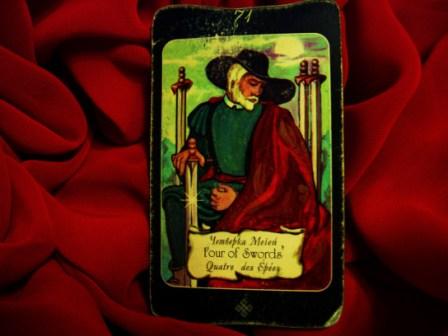 4 МЕЧЕЙ Тоже неоднозначная карта, с "двойным дном" и как бы это правильно объяснить? Немного о символике скажу. Карта вроде бы и статична, но... есть в ней напряжение: одна рука человека лежит на эфесе меча -- он не окончательно сдался и не собирается сдаваться. Другая рука сжата в кулак-- что говорит о том, что он испытывает негативные эмоции и защищается, закрывается, уходит в себя, эмоции не проявляются, он их контролирует осознанно. Он стоит на одном колене -- т.е. готов встать и двигаться вперед, он не покорен, не окончательно сломлен. На голове большая шляпа --- символ власти и силы, означает мысль, а покрытая голова -- свободное состояние. И пусть он пока на коленях, явно не действует, но он находится в процессе переосмысления случившегося, анализирует свою жизнь, или обстоятельства. 3 меча за его спиной --- это то, что случилось с ним в прошлом, то, что заставило его остановиться и задуматься, почему это произошло. На небе видим полную Луну -- тревожное состояние, в душе темно, до "рассвета" еще далеко, а "утро вечера мудренее", восстановление. На плечи накинут плащ красного цвета, на котором видим символы Рака --- эмоции, дом, семья, материнство, глубокие внутренние переживания, которые никому не видны. Красный цвет плаща --это Марс -- есть силы сопротивляться внешним обстоятельствам, желание жить, только нужно время на осмысление (шляпа) и выбор направления в своей жизни.